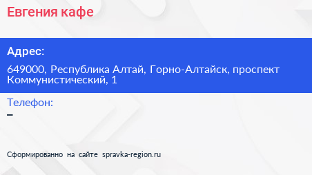 Евгения, кафе по адресу 649000, Республика Алтай, Горно-Алтайск, проспект Коммунистический, 1 в дальнейшем Организация, размещена в следующих категориях: