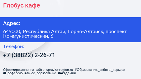 Глобус, кафе по адресу 649000, Республика Алтай, Горно-Алтайск, проспект Коммунистический, 6 в дальнейшем Организация, размещена в следующих категориях: