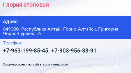 Глория, столовая по адресу 649000, Республика Алтай, Горно-Алтайск, Григория Чорос-Гуркина, 6 в дальнейшем Организация, размещена в следующих категориях: