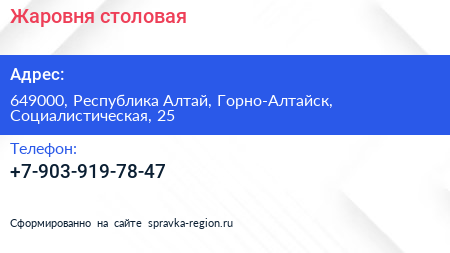 Жаровня, столовая по адресу 649000, Республика Алтай, Горно-Алтайск, Социалистическая, 25 в дальнейшем Организация, размещена в следующих категориях: