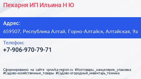 Пекарня, ИП Ильина Н.Ю. по адресу 659507, Республика Алтай, Горно-Алтайск, Алтайская, 9а в дальнейшем Организация, размещена в следующих категориях: