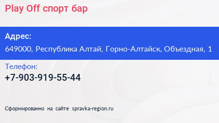 Play Off, спорт-бар по адресу 649000, Республика Алтай, Горно-Алтайск, Объездная, 1 в дальнейшем Организация, размещена в следующих категориях: