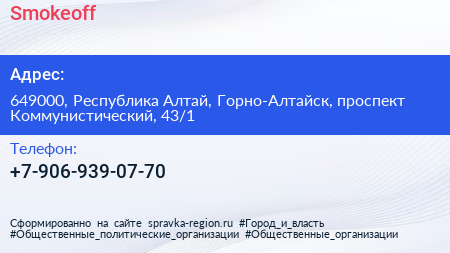 Smokeoff по адресу 649000, Республика Алтай, Горно-Алтайск, проспект Коммунистический, 43/1 в дальнейшем Организация, размещена в следующих категориях: