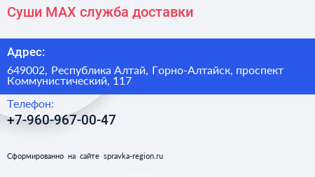 Суши MAX, служба доставки по адресу 649002, Республика Алтай, Горно-Алтайск, проспект Коммунистический, 117 в дальнейшем Организация, размещена в следующих категориях:
