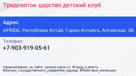 Тридевятое царство, детский клуб по адресу 649006, Республика Алтай, Горно-Алтайск, Алтайская, 38 в дальнейшем Организация, размещена в следующих категориях: