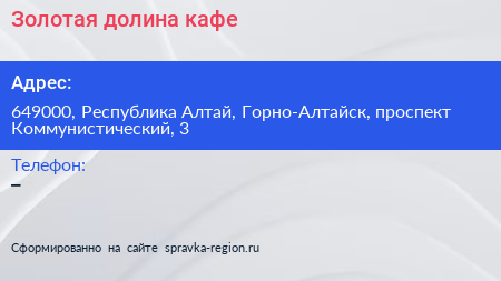 Золотая долина, кафе по адресу 649000, Республика Алтай, Горно-Алтайск, проспект Коммунистический, 3 в дальнейшем Организация, размещена в следующих категориях: