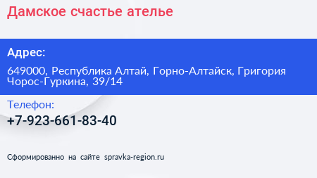 Дамское счастье, ателье по адресу 649000, Республика Алтай, Горно-Алтайск, Григория Чорос-Гуркина, 39/14 в дальнейшем Организация, размещена в следующих категориях: