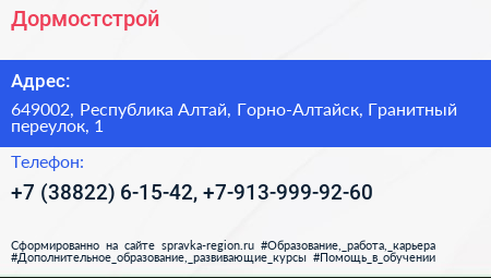 Дормостстрой по адресу 649002, Республика Алтай, Горно-Алтайск, Гранитный переулок, 1 в дальнейшем Организация, размещена в следующих категориях:
