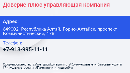 Доверие плюс, управляющая компания по адресу 649002, Республика Алтай, Горно-Алтайск, проспект Коммунистический, 178 в дальнейшем Организация, размещена в следующих категориях: