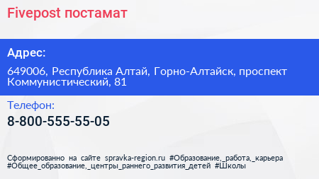 Fivepost, постамат по адресу 649006, Республика Алтай, Горно-Алтайск, проспект Коммунистический, 81 в дальнейшем Организация, размещена в следующих категориях: