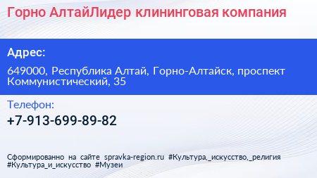 Горно-АлтайЛидер, клининговая компания по адресу 649000, Республика Алтай, Горно-Алтайск, проспект Коммунистический, 35 в дальнейшем Организация, размещена в следующих категориях: