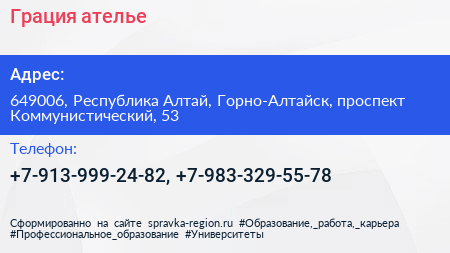 Грация, ателье по адресу 649006, Республика Алтай, Горно-Алтайск, проспект Коммунистический, 53 в дальнейшем Организация, размещена в следующих категориях: