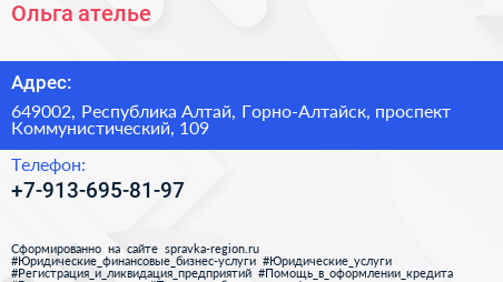 Ольга, ателье по адресу 649002, Республика Алтай, Горно-Алтайск, проспект Коммунистический, 109 в дальнейшем Организация, размещена в следующих категориях: