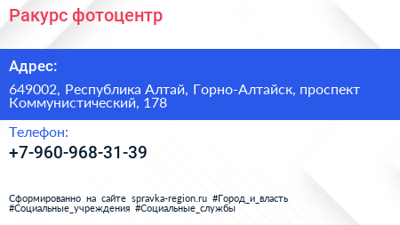 Ракурс, фотоцентр по адресу 649002, Республика Алтай, Горно-Алтайск, проспект Коммунистический, 178 в дальнейшем Организация, размещена в следующих категориях: