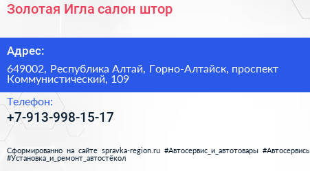 Золотая Игла, салон штор по адресу 649002, Республика Алтай, Горно-Алтайск, проспект Коммунистический, 109 в дальнейшем Организация, размещена в следующих категориях: