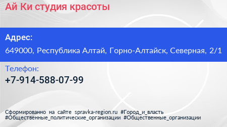 Ай Ки, студия красоты по адресу 649000, Республика Алтай, Горно-Алтайск, Северная, 2/1 в дальнейшем Организация, размещена в следующих категориях: