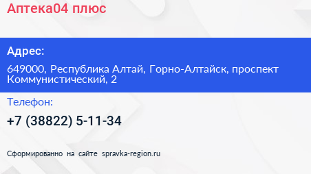 Аптека04 плюс по адресу 649000, Республика Алтай, Горно-Алтайск, проспект Коммунистический, 2 в дальнейшем Организация, размещена в следующих категориях: