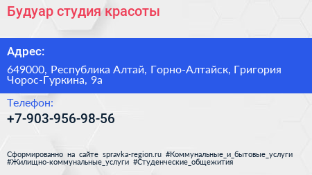 Будуар, студия красоты по адресу 649000, Республика Алтай, Горно-Алтайск, Григория Чорос-Гуркина, 9а в дальнейшем Организация, размещена в следующих категориях: