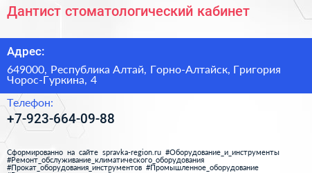 Дантист, стоматологический кабинет по адресу 649000, Республика Алтай, Горно-Алтайск, Григория Чорос-Гуркина, 4 в дальнейшем Организация, размещена в следующих категориях: