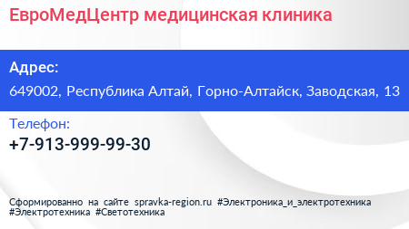ЕвроМедЦентр, медицинская клиника по адресу 649002, Республика Алтай, Горно-Алтайск, Заводская, 13 в дальнейшем Организация, размещена в следующих категориях: