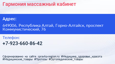 Гармония, массажный кабинет по адресу 649006, Республика Алтай, Горно-Алтайск, проспект Коммунистический, 76 в дальнейшем Организация, размещена в следующих категориях:
