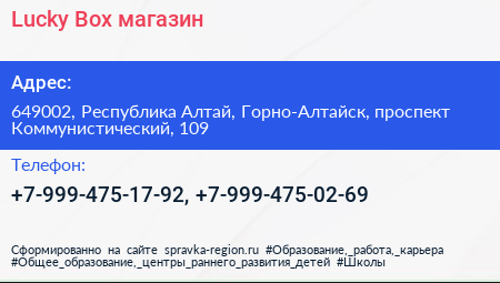 Lucky Box, магазин по адресу 649002, Республика Алтай, Горно-Алтайск, проспект Коммунистический, 109 в дальнейшем Организация, размещена в следующих категориях: