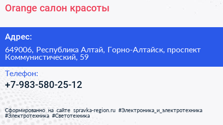 Orange, салон красоты по адресу 649006, Республика Алтай, Горно-Алтайск, проспект Коммунистический, 59 в дальнейшем Организация, размещена в следующих категориях: