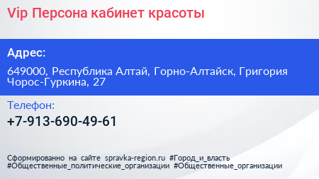 Vip Персона, кабинет красоты по адресу 649000, Республика Алтай, Горно-Алтайск, Григория Чорос-Гуркина, 27 в дальнейшем Организация, размещена в следующих категориях: