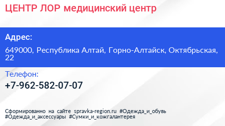 ЦЕНТР ЛОР, медицинский центр по адресу 649000, Республика Алтай, Горно-Алтайск, Октябрьская, 22 в дальнейшем Организация, размещена в следующих категориях: