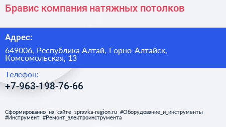Бравис, компания натяжных потолков по адресу 649006, Республика Алтай, Горно-Алтайск, Комсомольская, 13 в дальнейшем Организация, размещена в следующих категориях: