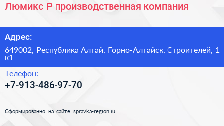 Люмикс-Р, производственная компания по адресу 649002, Республика Алтай, Горно-Алтайск, Строителей, 1 к1 в дальнейшем Организация, размещена в следующих категориях: