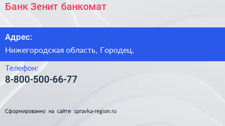 Банк Зенит, банкомат по адресу Нижегородская область, Городец, в дальнейшем Организация, размещена в следующих категориях: