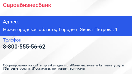 Саровбизнесбанк по адресу Нижегородская область, Городец, Якова Петрова, 1 в дальнейшем Организация, размещена в следующих категориях: