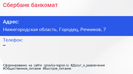Сбербанк, банкомат по адресу Нижегородская область, Городец, Речников, 7 в дальнейшем Организация, размещена в следующих категориях: