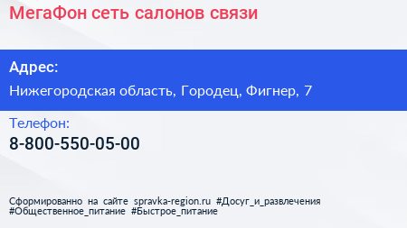МегаФон, сеть салонов связи по адресу Нижегородская область, Городец, Фигнер, 7 в дальнейшем Организация, размещена в следующих категориях: