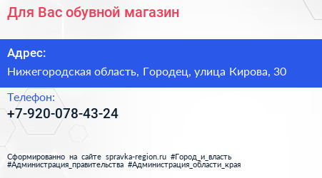Для Вас, обувной магазин по адресу Нижегородская область, Городец, улица Кирова, 30 в дальнейшем Организация, размещена в следующих категориях: