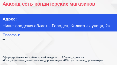 Акконд, сеть кондитерских магазинов по адресу Нижегородская область, Городец, Колхозная улица, 2а в дальнейшем Организация, размещена в следующих категориях: