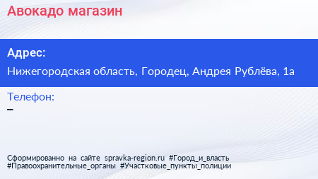 Авокадо, магазин по адресу Нижегородская область, Городец, Андрея Рублёва, 1а в дальнейшем Организация, размещена в следующих категориях: