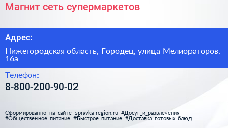 Магнит, сеть супермаркетов по адресу Нижегородская область, Городец, улица Мелиораторов, 16а в дальнейшем Организация, размещена в следующих категориях: