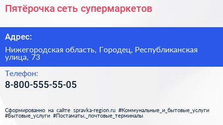 Пятёрочка, сеть супермаркетов по адресу Нижегородская область, Городец, Республиканская улица, 73 в дальнейшем Организация, размещена в следующих категориях:
