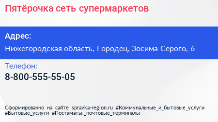 Пятёрочка, сеть супермаркетов по адресу Нижегородская область, Городец, Зосима Серого, 6 в дальнейшем Организация, размещена в следующих категориях: