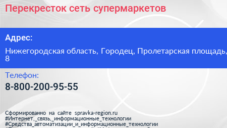 Перекресток, сеть супермаркетов по адресу Нижегородская область, Городец, Пролетарская площадь, 8 в дальнейшем Организация, размещена в следующих категориях: