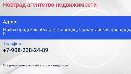 Новград, агентство недвижимости по адресу Нижегородская область, Городец, Пролетарская площадь, 8 в дальнейшем Организация, размещена в следующих категориях: