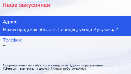 Кафе-закусочная по адресу Нижегородская область, Городец, улица Кутузова, 2 в дальнейшем Организация, размещена в следующих категориях: