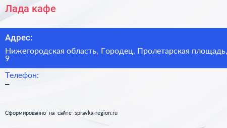 Лада, кафе по адресу Нижегородская область, Городец, Пролетарская площадь, 9 в дальнейшем Организация, размещена в следующих категориях: