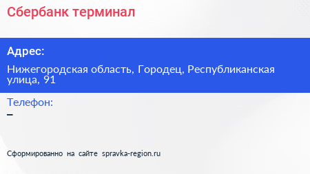 Сбербанк, терминал по адресу Нижегородская область, Городец, Республиканская улица, 91 в дальнейшем Организация, размещена в следующих категориях: