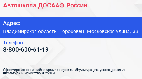 Автошкола, ДОСААФ России по адресу Владимирская область, Гороховец, Московская улица, 33 в дальнейшем Организация, размещена в следующих категориях: