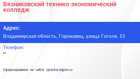 Вязниковский технико-экономический колледж по адресу Владимирская область, Гороховец, улица Гоголя, 15 в дальнейшем Организация, размещена в следующих категориях: