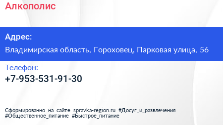 Алкополис по адресу Владимирская область, Гороховец, Парковая улица, 56 в дальнейшем Организация, размещена в следующих категориях: