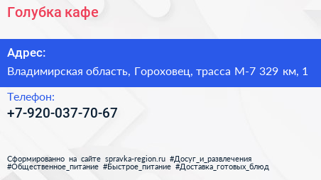 Голубка, кафе по адресу Владимирская область, Гороховец, трасса М-7 329 км, 1 в дальнейшем Организация, размещена в следующих категориях: